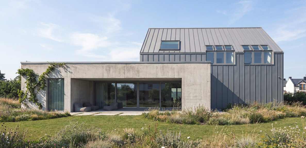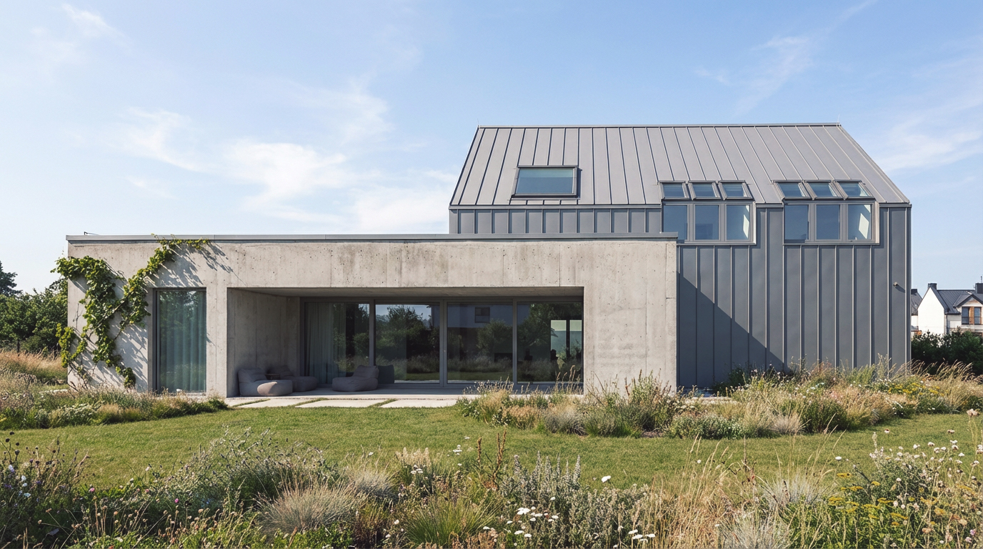 Dom zaprojektowano jako zestawienie dwóch prostych brył – wysokiej formy domu ze stromym dachem oraz niskiego betonowego pawilonu, który osłania wejście i otwiera część dzienną na ogród.