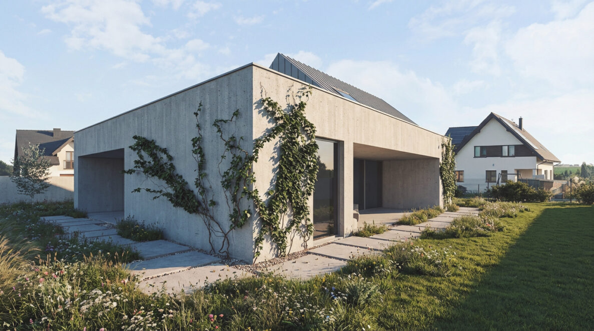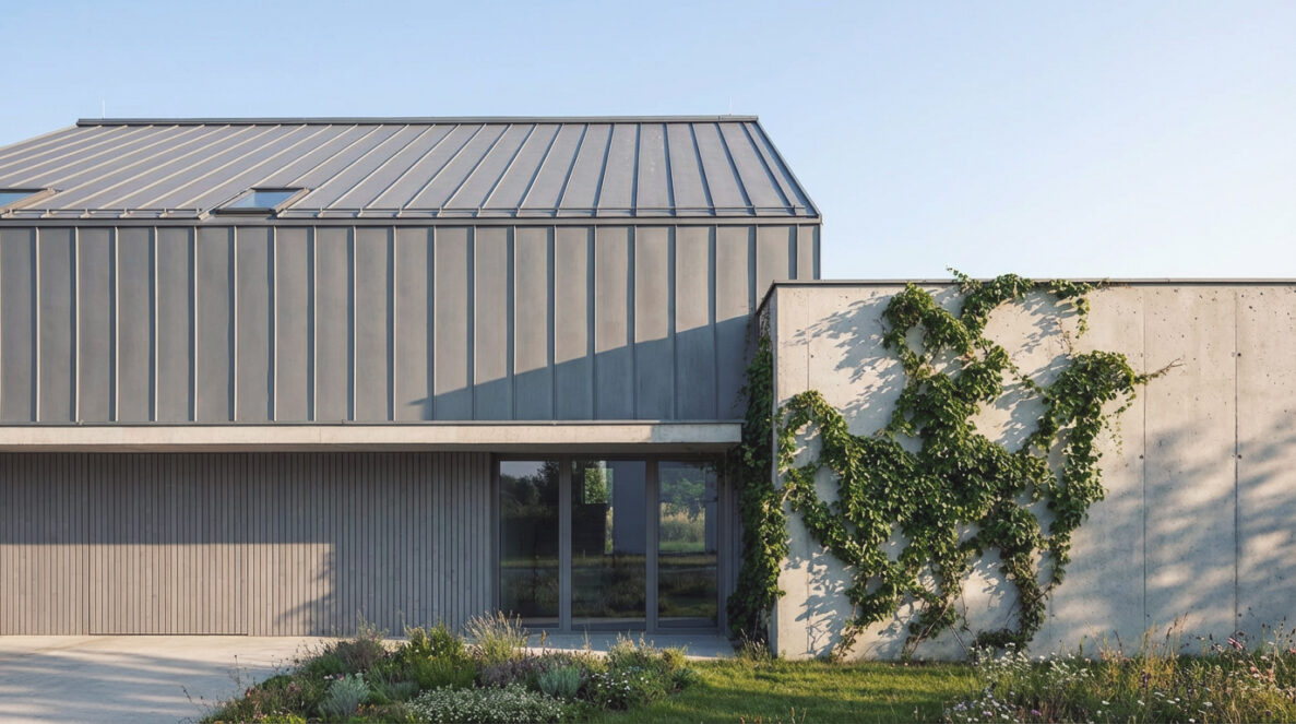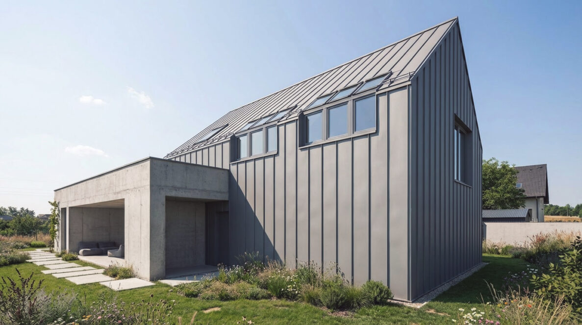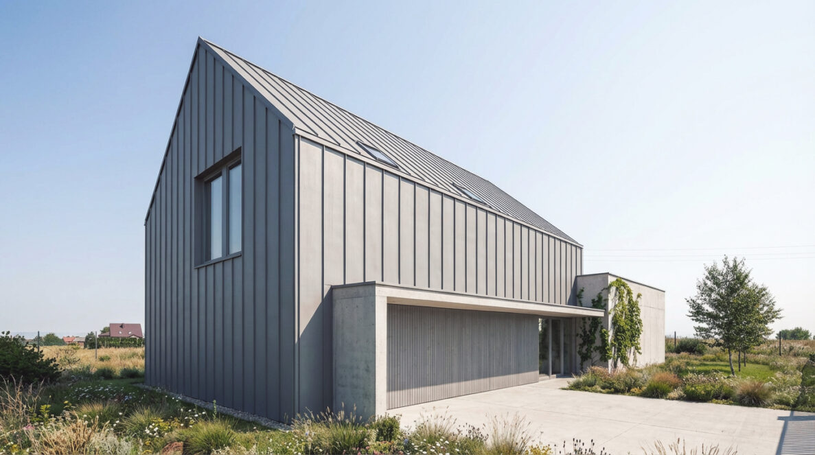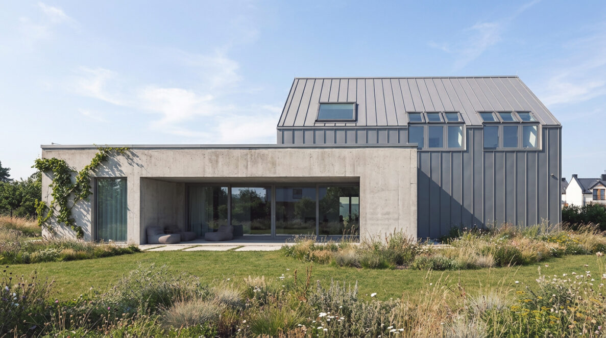 Estetyka budynku opiera się na zestawieniu dwóch materiałów. Parterowy pawilon wykonano z surowego betonu architektonicznego, który tworzy ciężką, stabilną bazę dla całego domu. Piętrową część domu pokryto metalową okładziną w pionowym układzie rąbka, która płynnie przechodzi z elewacji w połać dachu, nadając bryle jednolity i minimalistyczny charakter.